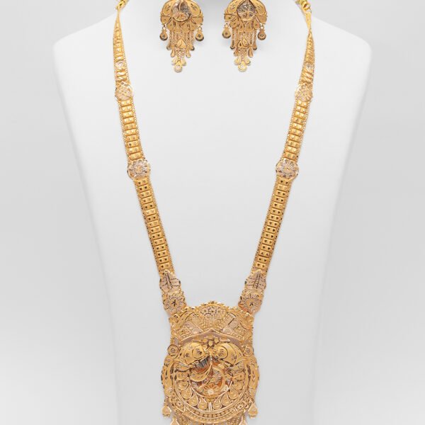 Enhance your regal elegance with this fancy melting 18K gold long necklace and earrings set, meticulously handcrafted to perfection. The intricate melting design and glossy finish highlight timeless craftsmanship, making it a statement piece for bridal wear, festive occasions, or luxury celebrations. This stunning creation reflects grace, grandeur, and traditional […]